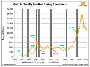 We certainly can, though we hope for the best. Either way, here’s a useful graph to illustrate what gold might do during the next recession, according to data from Thomson Reuters and the Federal Reserve: